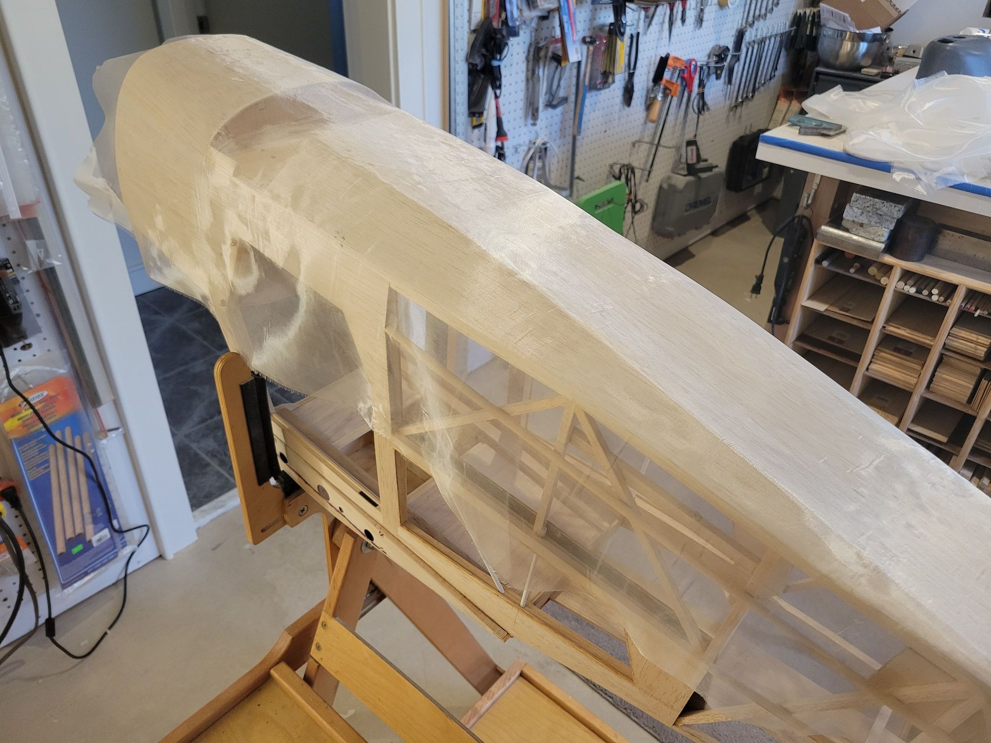 I'm using 1/2 ounce cloth to cover the sheeted areas of this plane. 1/2 ounce cloth is very light and has to be handled delicately. It will conform incredibly well around curves.